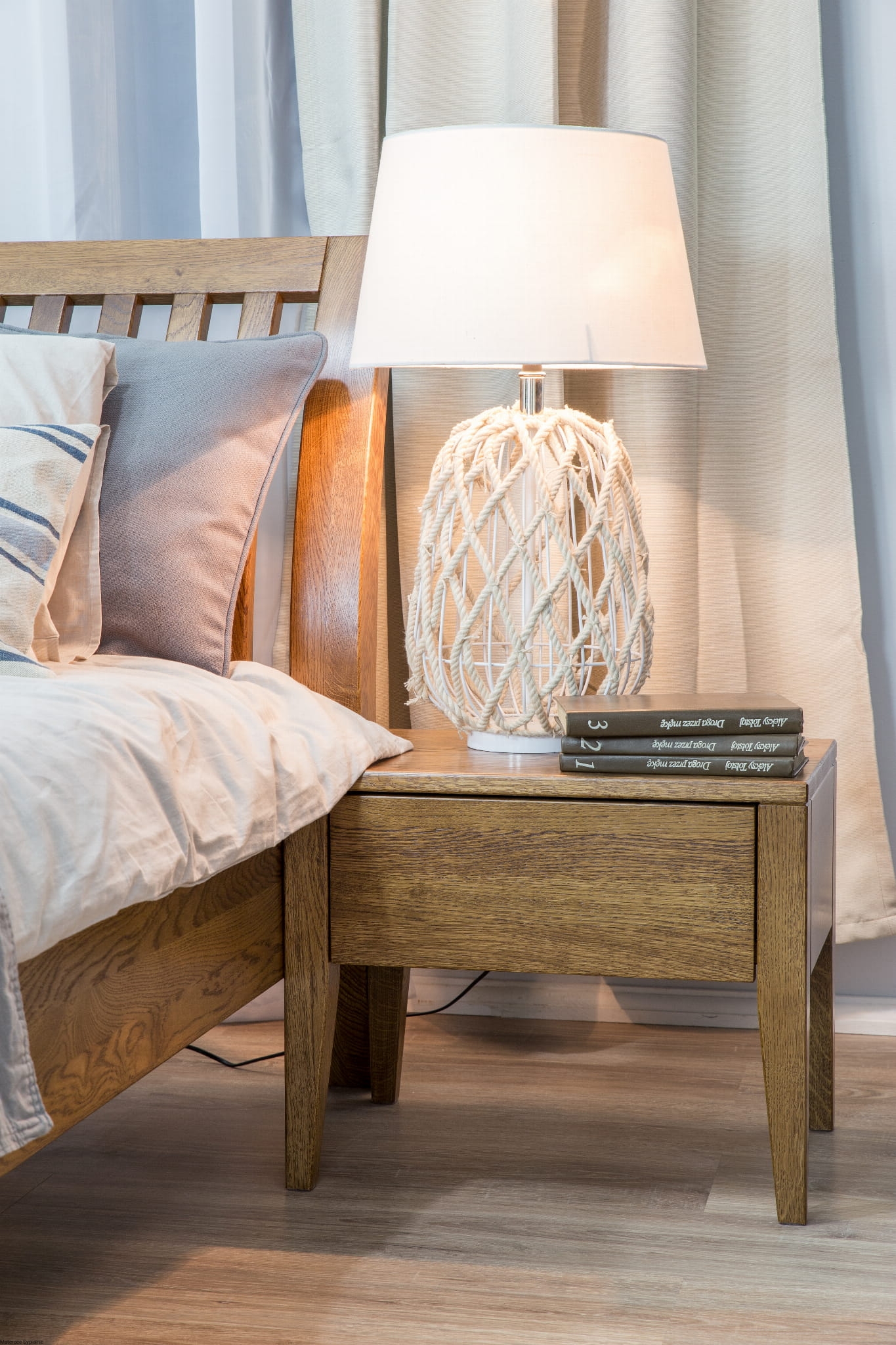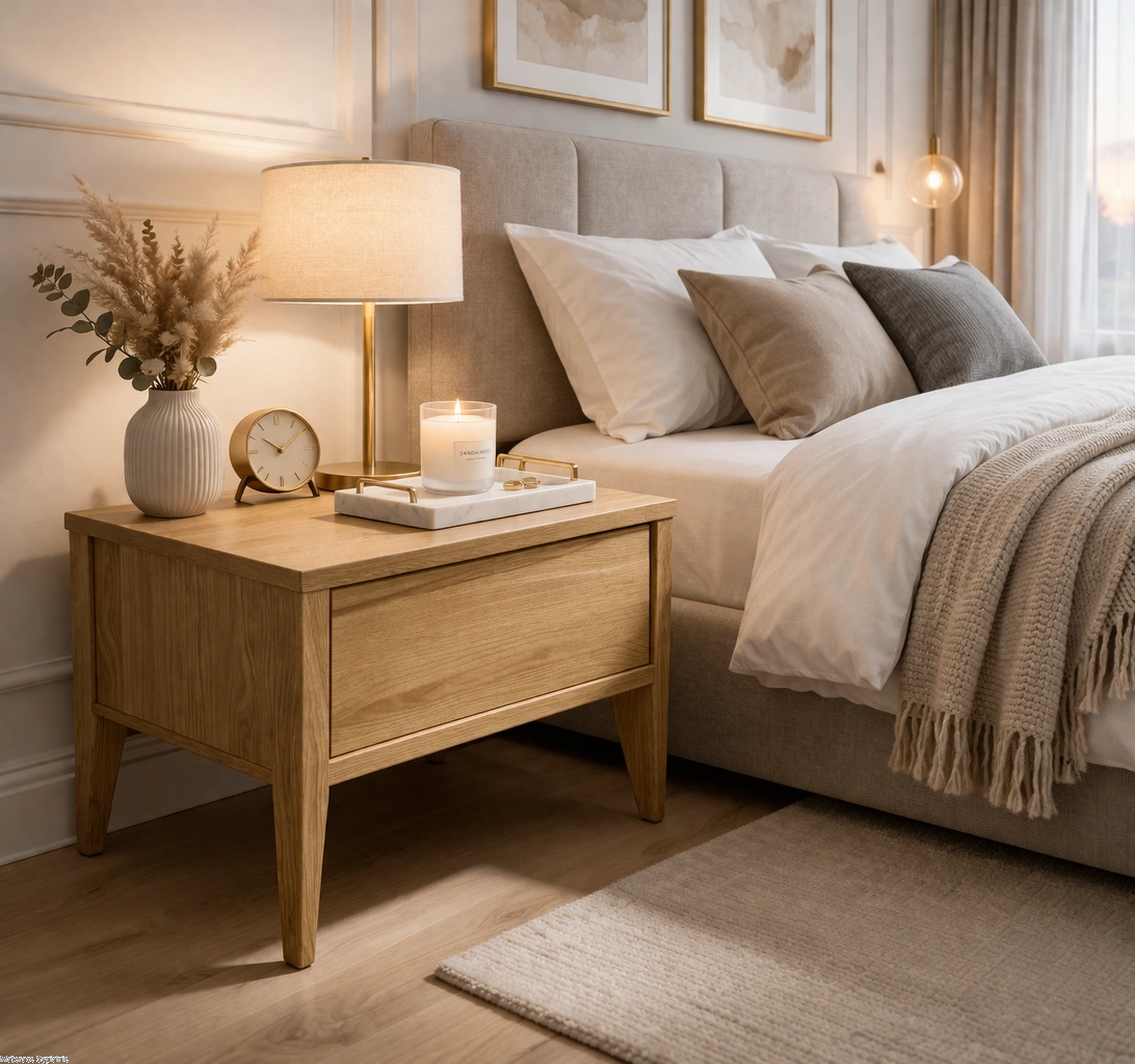 - Funkcjonalność w małych przestrzeniach – szuflada i blat dają miejsce na wszystko, co potrzebne przy łóżku.