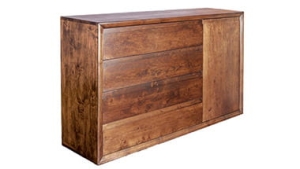 Komoda 4/2 to bardzo praktyczny mebel wykonany naturalnego drewna. Posiada ona cztery głębokie szuflady i boczną półkę. Fronty w komodzie podsiadają specjalnie wykonany frez, który zastępuje popularne uchwyty. Szuflady, zamontowane na prowadnicach kulkowych z cichym domykiem, lekko się otwierają i swobodnie przesuwają. Półka zamykana drzwiczkami z zawiasami z cichym domykiem, może być umiejscowiona z prawej lub lewej strony mebla. Komoda jest elegancka i świetnie komponuje się z innymi naszymi meblami.