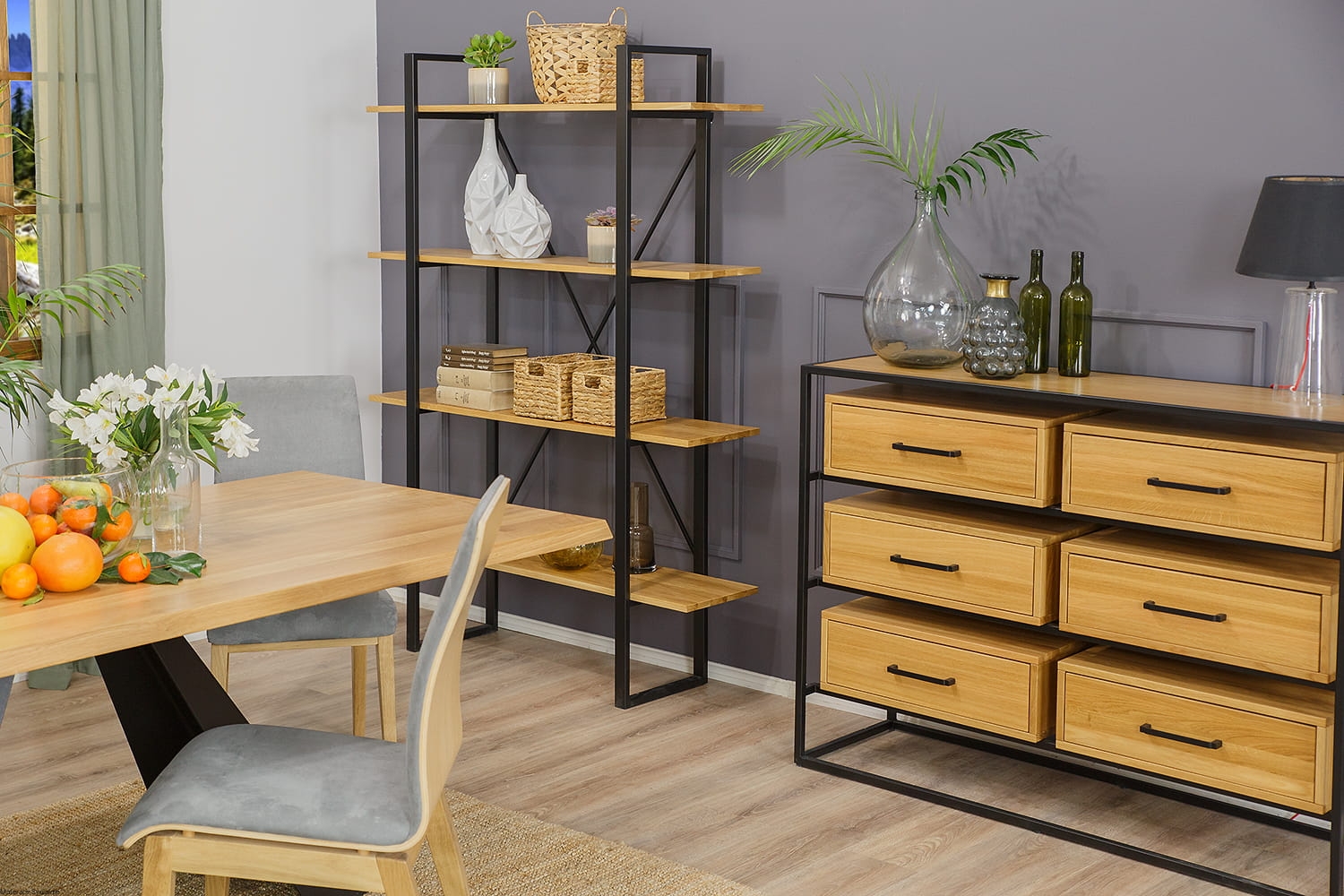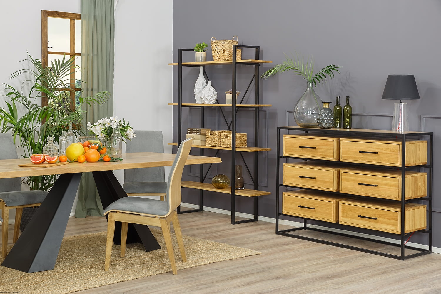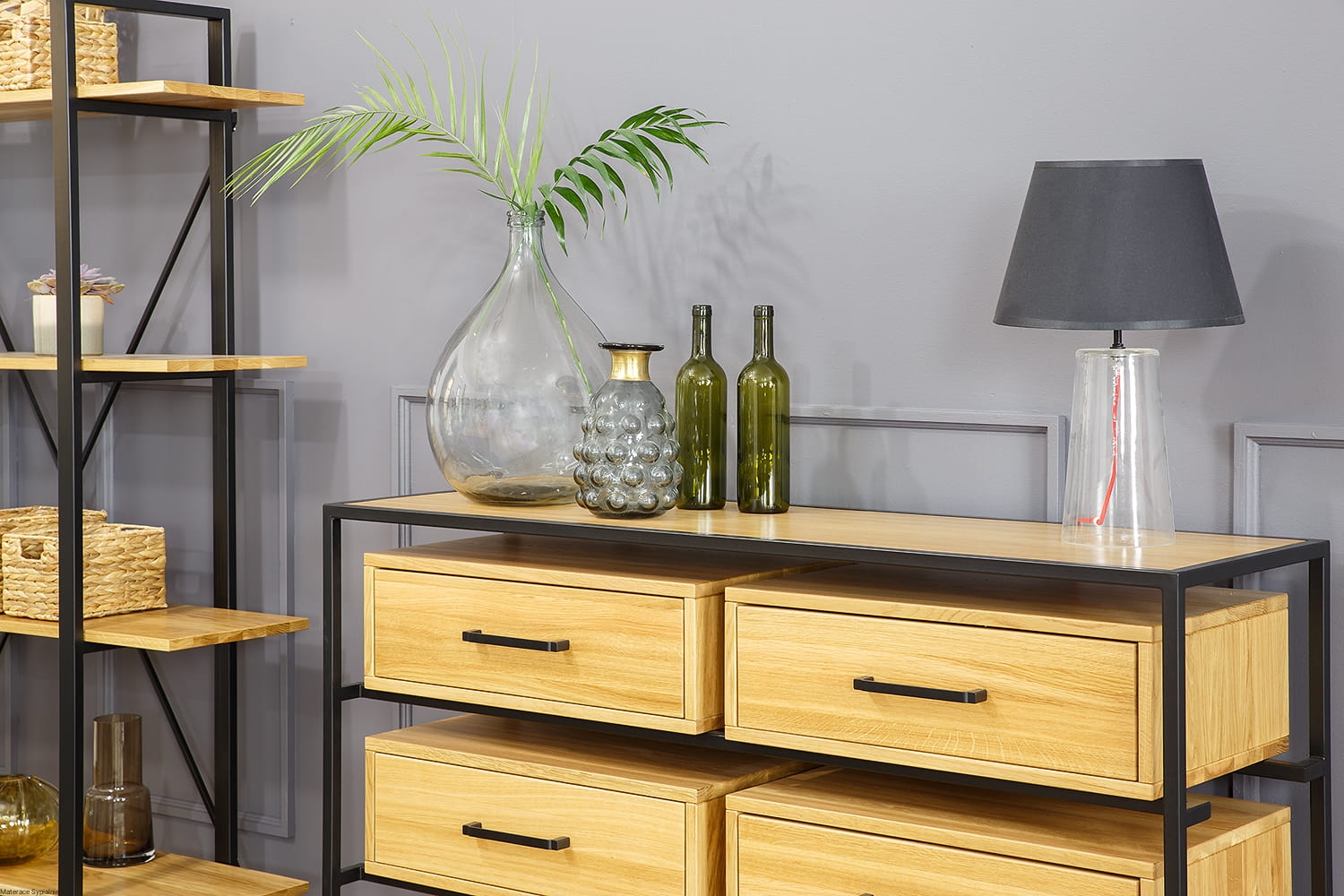 Komoda KD371 powstała z myślą o nowoczesnych, industrialnych aranżacjach. Charakteryzuje ją prosty design i geometryczne kształty. Funkcjonalne szuflady powstały z litego, naturalnego drewna dębowego. Cała konstrukcja wkomponowana została w metalową ramę. Dzięki temu powstał niebanalny design, który może stanowić centralny punkt każdej aranżacji. Komoda KD371 to idealny mebel do nowoczesnych, modnych wnętrz.