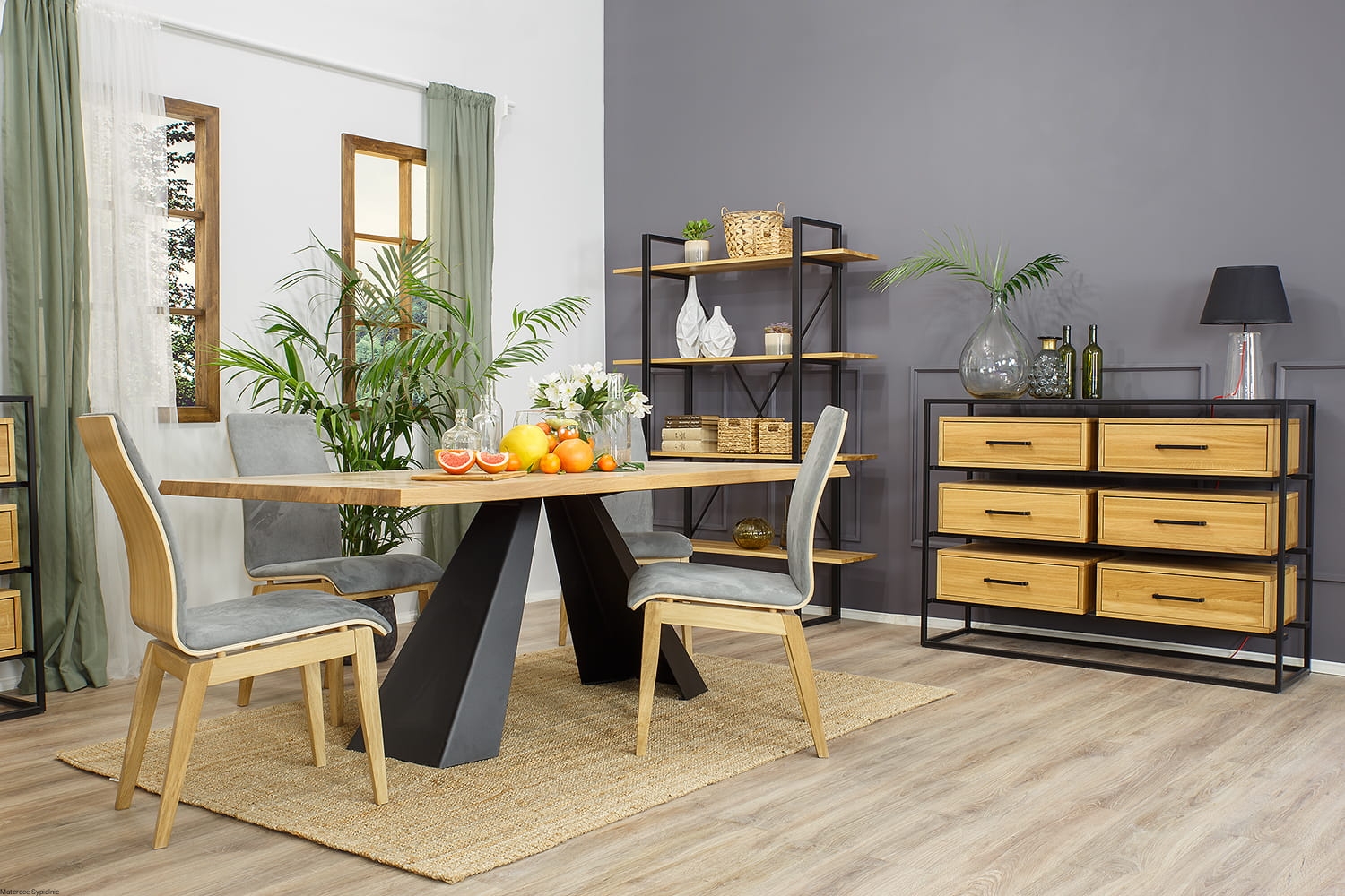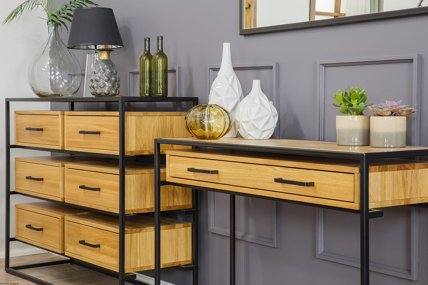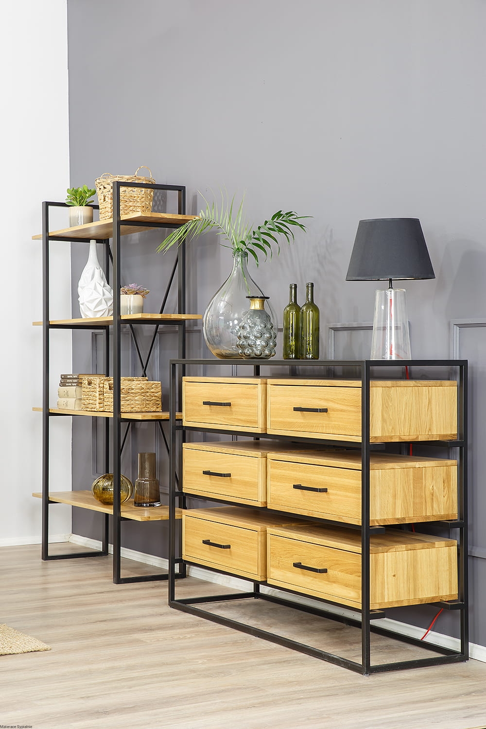 Komoda KD371 powstała z myślą o nowoczesnych, industrialnych aranżacjach. Charakteryzuje ją prosty design i geometryczne kształty. Funkcjonalne szuflady powstały z litego, naturalnego drewna dębowego. Cała konstrukcja wkomponowana została w metalową ramę. Dzięki temu powstał niebanalny design, który może stanowić centralny punkt każdej aranżacji. Komoda KD371 to idealny mebel do nowoczesnych, modnych wnętrz.
