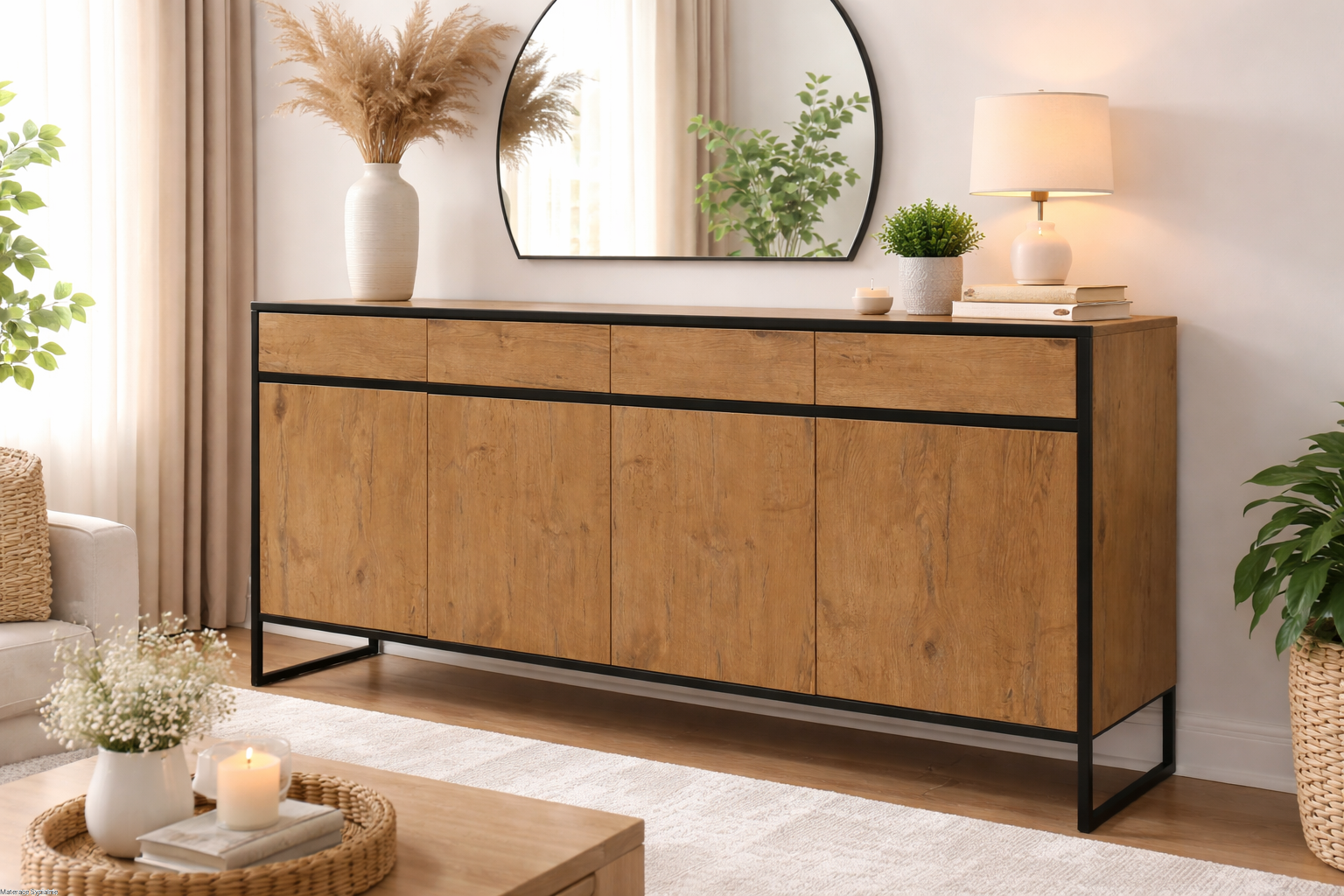 Komoda Loft Industrial to duża komoda do salonu w stylu loft, łącząca naturalne drewno z metalowymi elementami. Funkcjonalna, pojemna i designerska – idealna do nowoczesnych i industrialnych wnętrz.