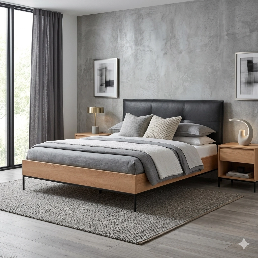 Loftowe łóżko z bardzo szlachetnej płyty meblowej w odcieniu miodowego dębu, z matową, bardzo przyjemną w dotyku powierzchnią przypominającą naturalne drewno. Wygodny, miękki, tapicerowany w sześć dużych prostokątów zagłówek wykończony ozdobną falbanką. Skrzynia wsparta na czarnej metalowej ramie połączonej z nóżkami.