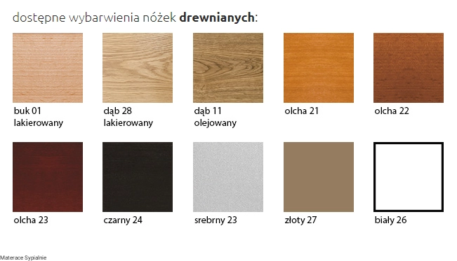 - Nóżki: buk, dąb olejowany, dąb lakierowany, biały, olcha, czarny, srebrny, złoty