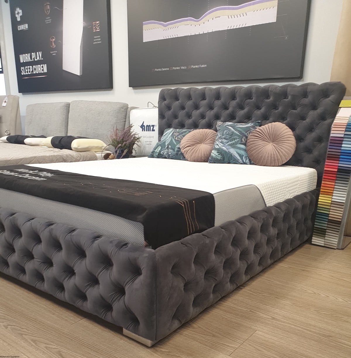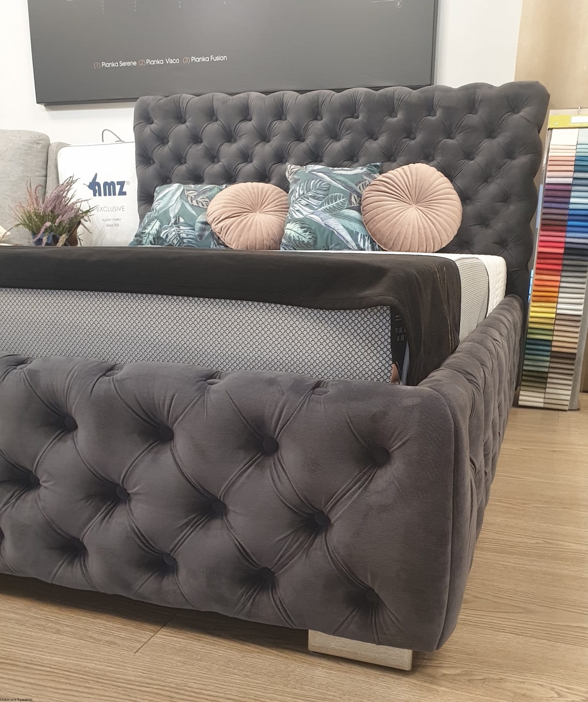 Łóżko Hawana dostępne jest w szerokiej gamie tkanin, aksamitnych, skór ekologicznych i naturalnych. Wszystkie próbki tkanin można obejrzeć w naszym salonie lub zamówić bezpłatnie do domu.