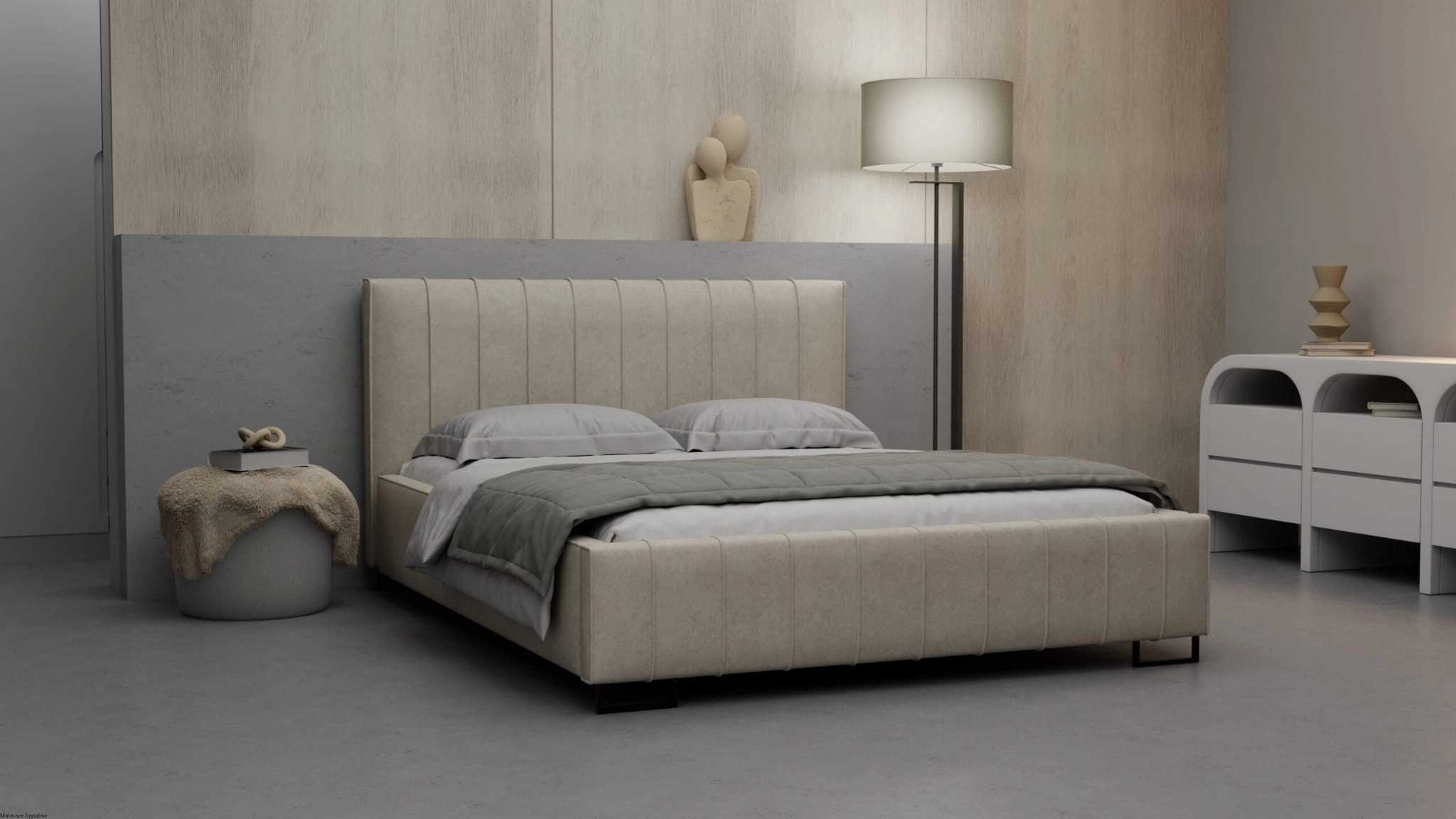 Odkryj łóżka Spira z przeszyciami w pasy na zagłówku i ramie – nowoczesne, eleganckie i komfortowe. Idealne do stylowej sypialni.