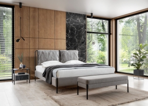 Nowoczesne łóżko z lekką, metalową konstrukcją i tapicerowanym wezgłowiem. Miękkie poduszki i eleganckie czarne nóżki tworzą wyjątkowy, lekki design do każdej sypialni.