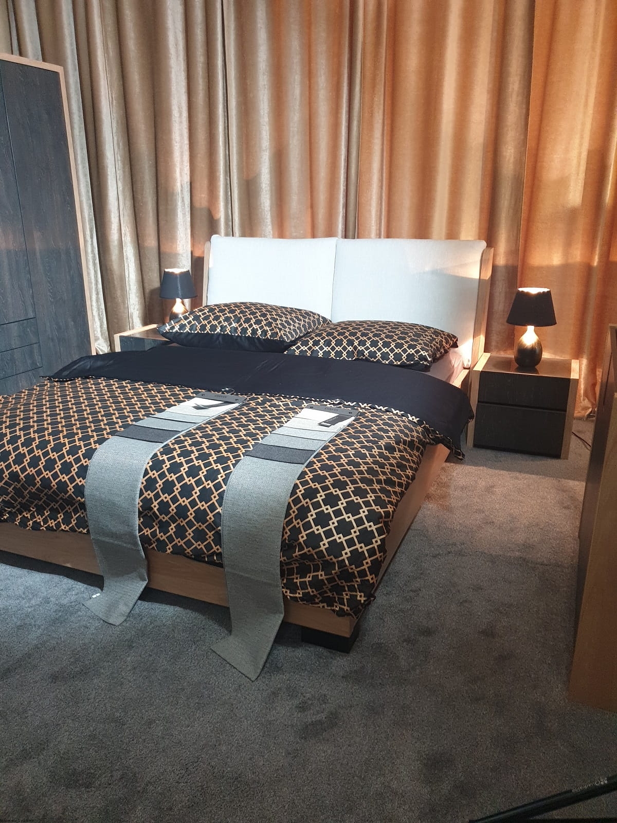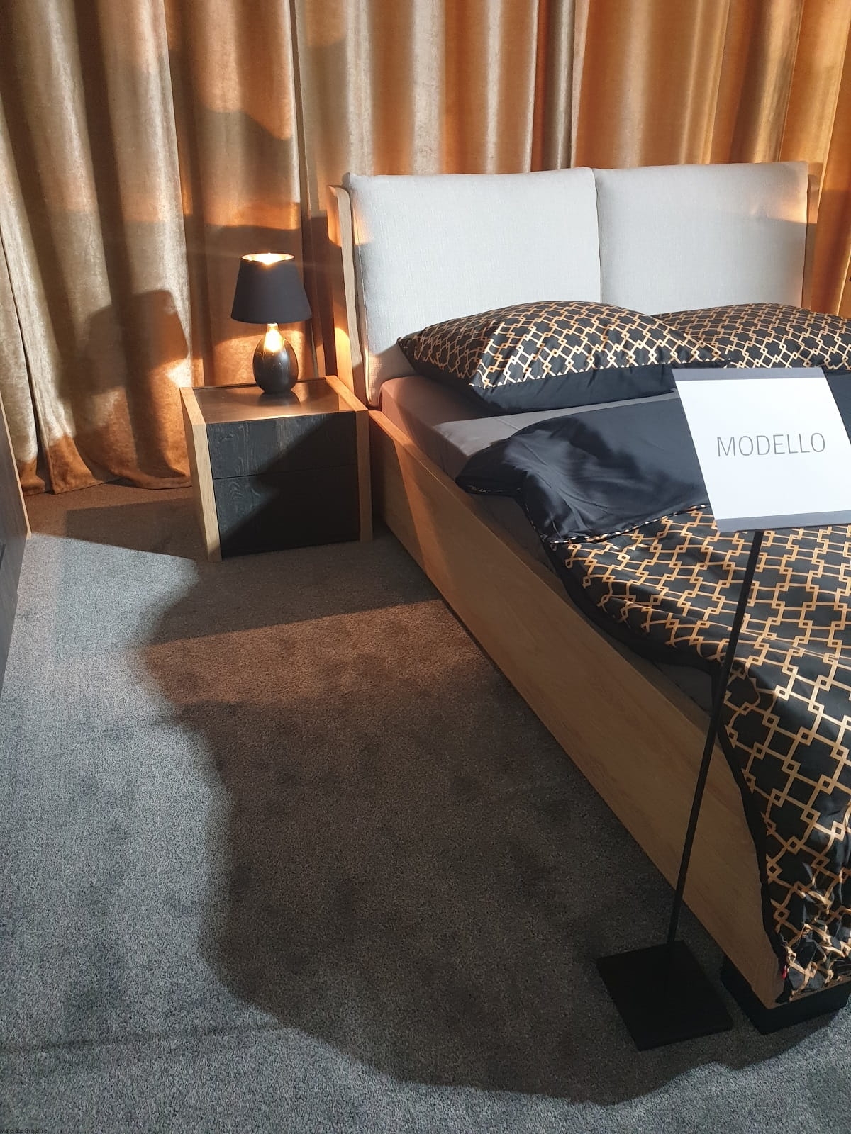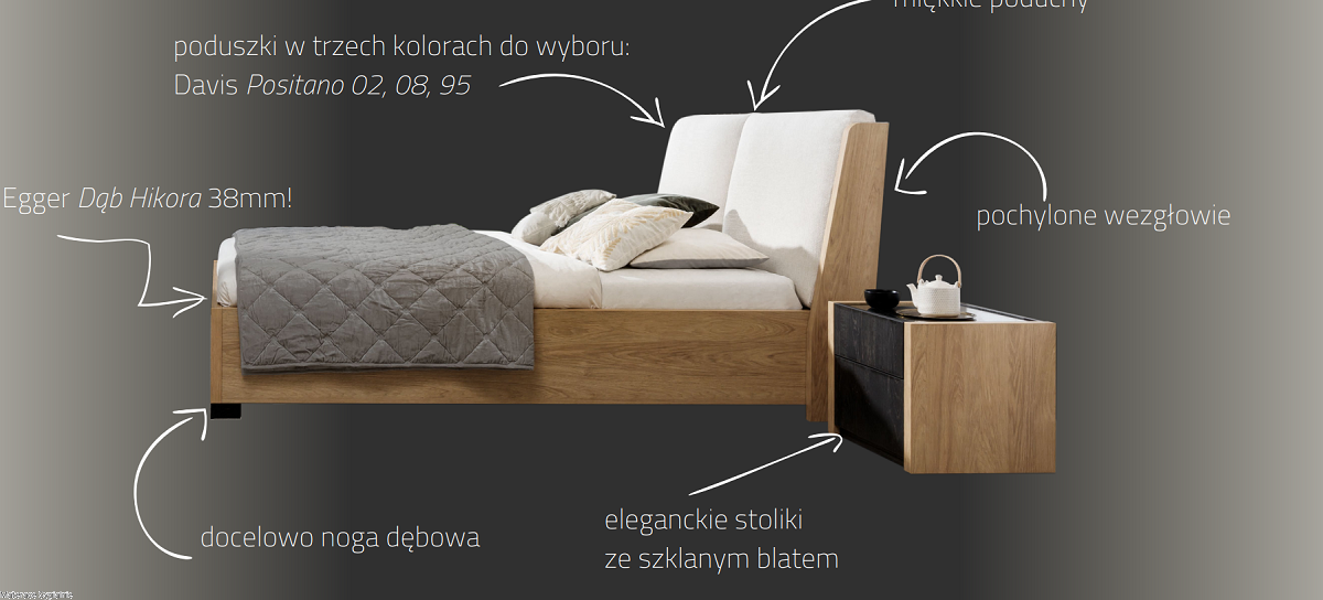Modello to propozycja dla osób, które cenią sobie elegancję i użyteczność. Dzięki swojej oryginalnej formie i połączeniu szlachetnej, laminowanej płyty meblowej (Dąb Baltic Dune Pfieiderer) z miękkimi poduchami (dostępnymi w trzech kolorach tkaniny Positano o strukturze plecionki), łóżko doskonale wpisuje się w estetykę loftową, industrialną oraz minimalistyczną.