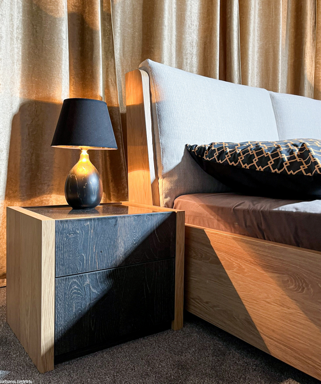 Jeśli szukasz kompleksowego rozwiązania, cała kolekcja sypialni Modello oferuje designerski zestaw z oryginalnej czarnej płyty Flamed Wood z miodowym rysunkiem drewna oraz dębu Hikora. Szklane blaty komód i stolików nocnych dodatkowo eksponują ciekawy rysunek palonego drewna.
