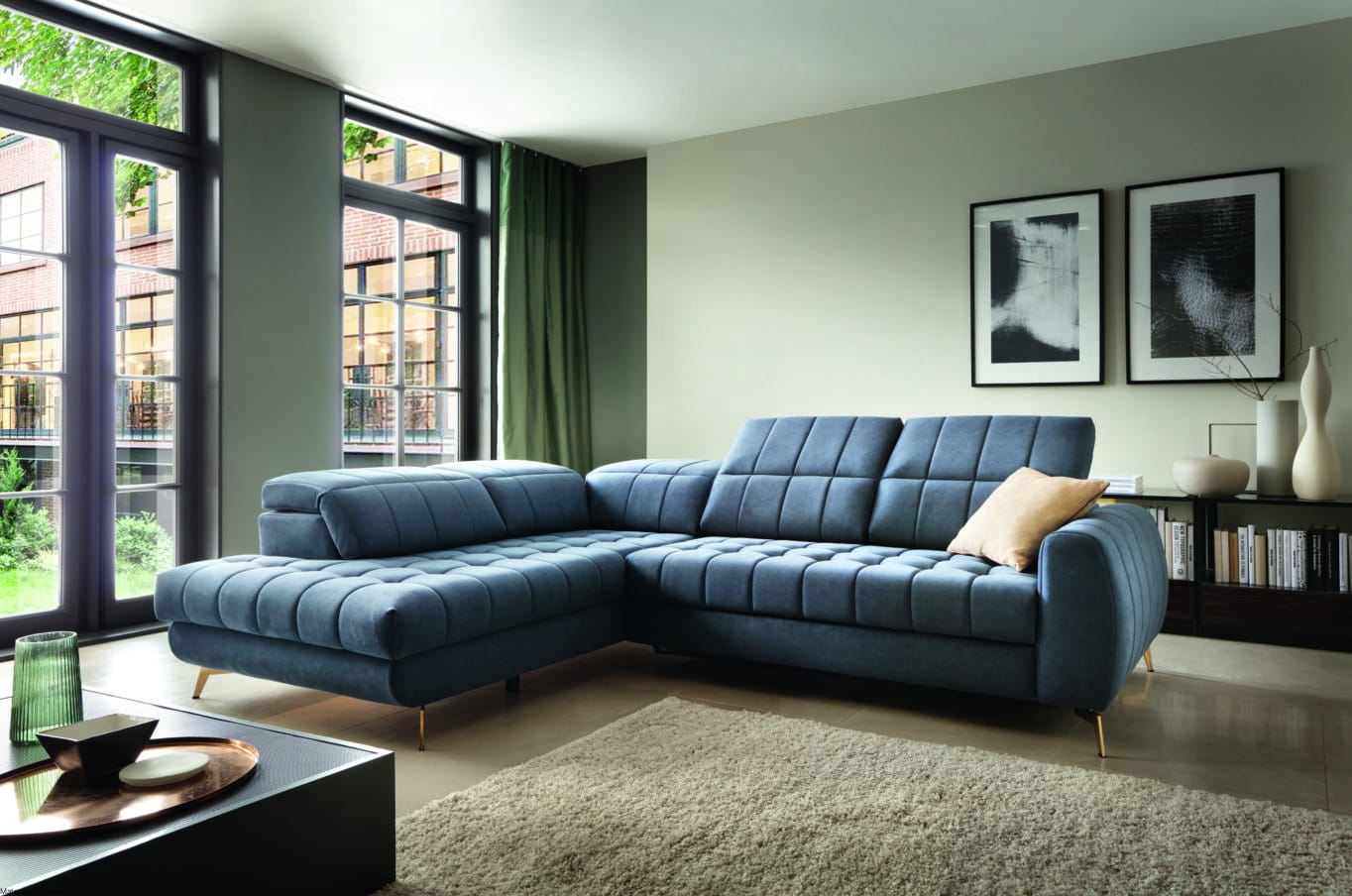 Narożnik Vesta przykuwa uwagę przede wszystkim głębokimi pikami na siedzisku. Przechodzące od nich przeszycia na oparcie i podłokietnik sprawiają, że całość prezentuje się spójnie, ale i bardzo elegancko. Dla podkreślenia tego efektu zastosowano metalowe, wysokie nóżki (12 cm), które występują w trzech kolorach – czarnym, srebrnym i złotym.