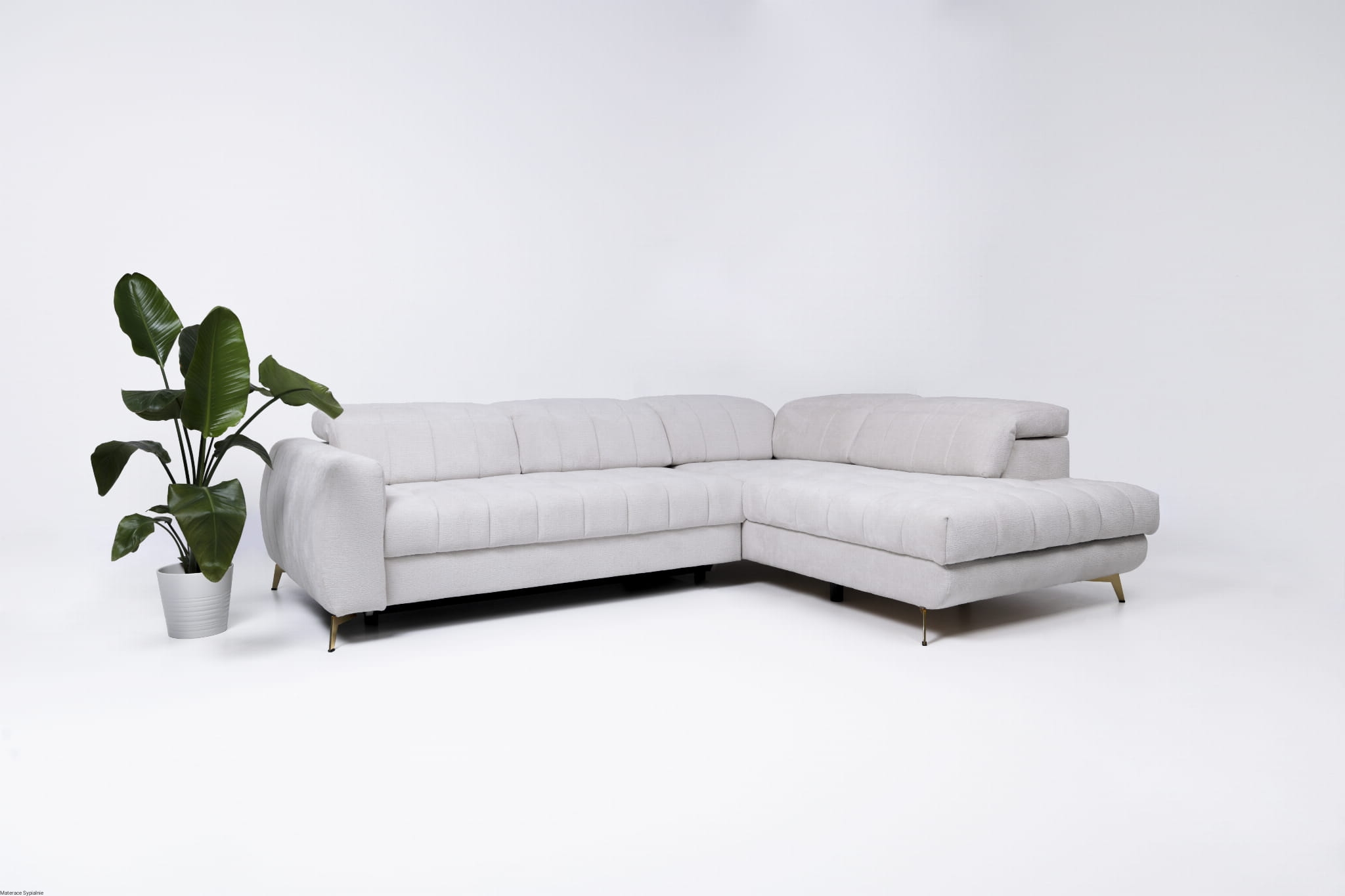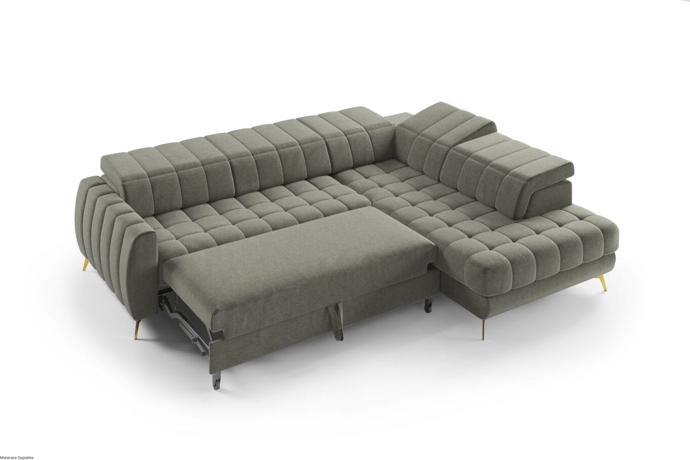 Narożnik został wyposażony w funkcję spania rozkładaną za pomocą mechanizmu typu „delfin” oraz pojemnik na pościel, który jest praktycznym rozwiązaniem do przechowywania np. dodatkowej pościeli na okazję przyjazdu gości.