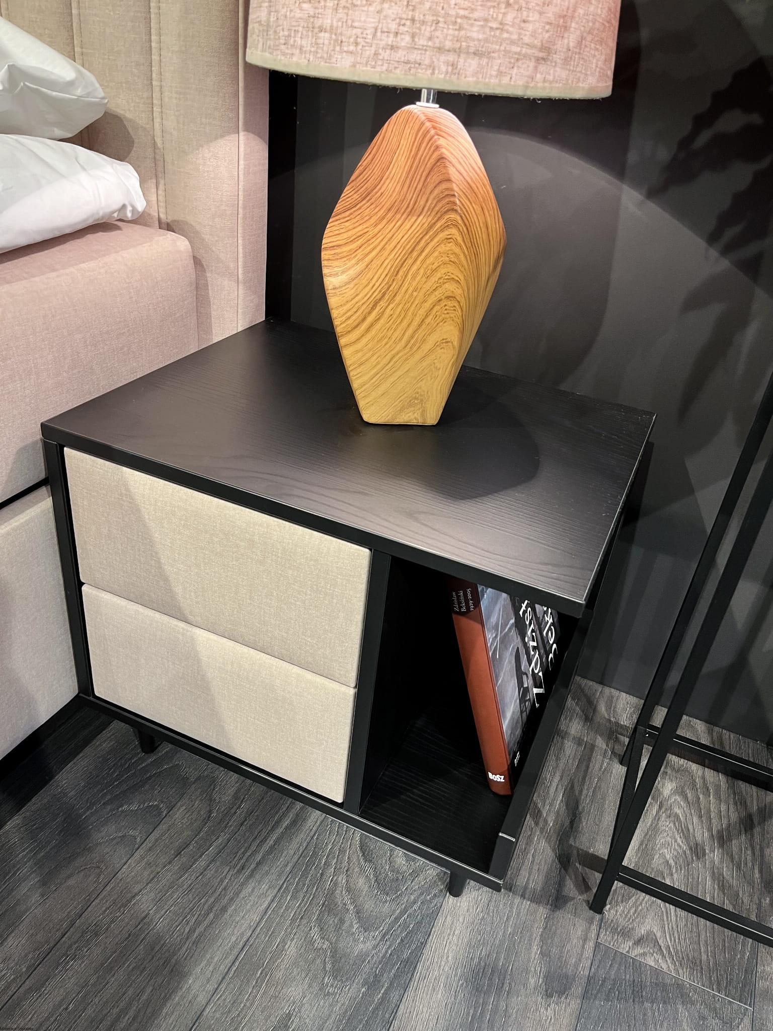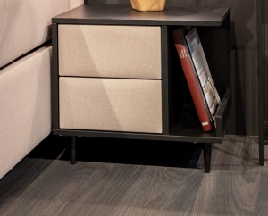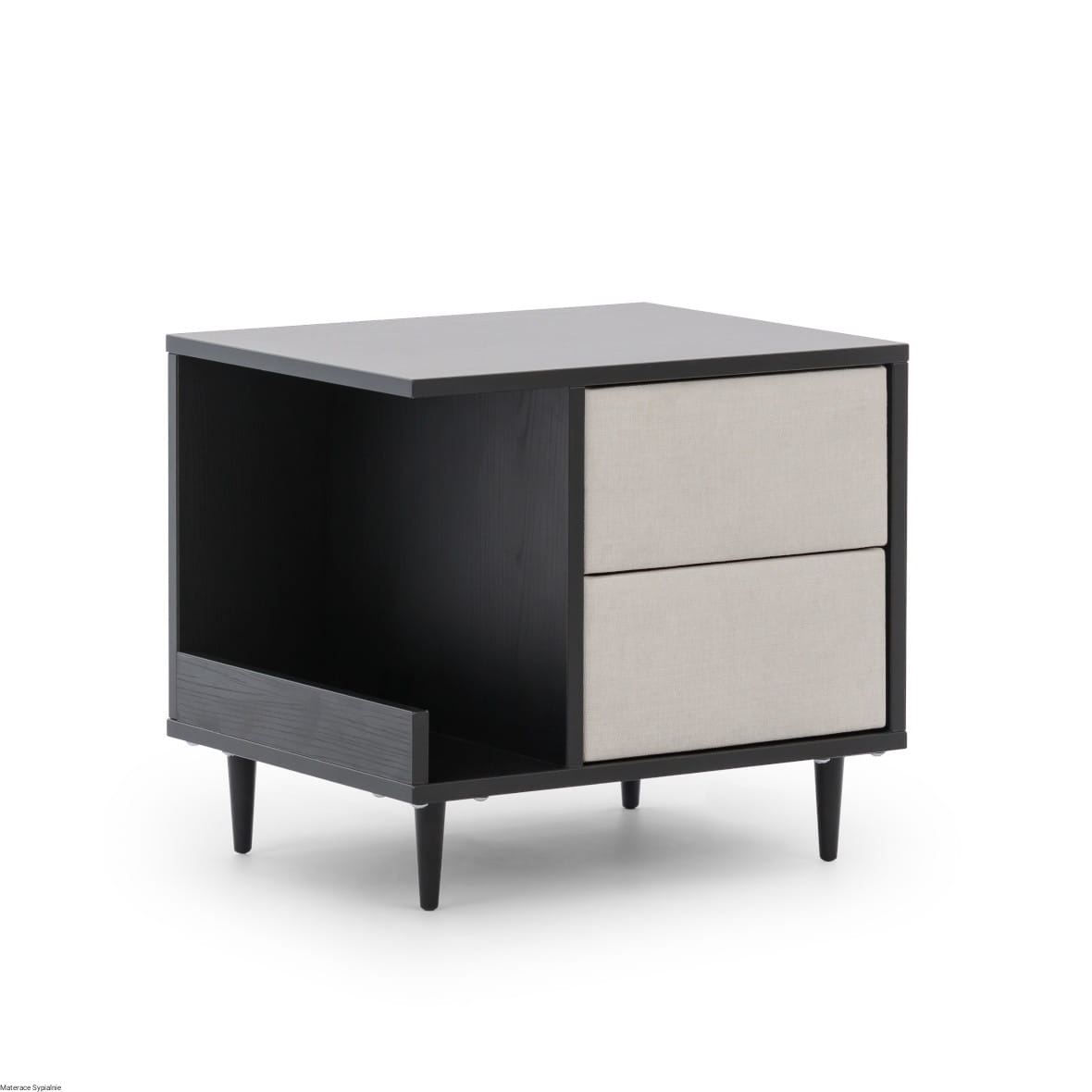 Stolik posiada smukłe, czarne nóżki, które podkreślają jego nowoczesny charakter. Korpus wykonany jest z czarnej płyty meblowej z widocznym usłojeniem, co nadaje mu elegancki wygląd. Fronty szuflad są tapicerowane w wybranej tkaninie, co pozwala na dopasowanie do indywidualnych preferencji kolorystycznych i teksturalnych.