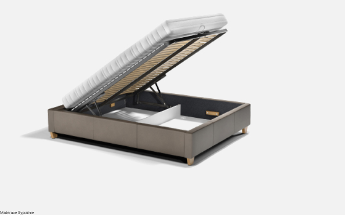 Łóżko wyposażone w stelaż na metalowej ramie, z gazowymi podnośnikami, które zabezpieczone zostały aby uniesiona skrzynia nie opadała.