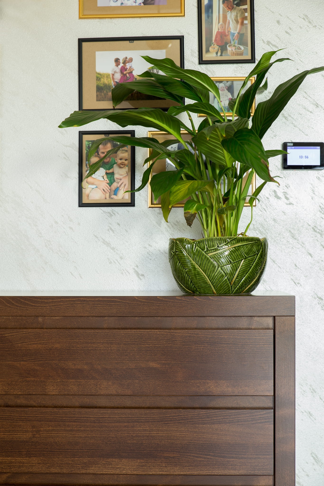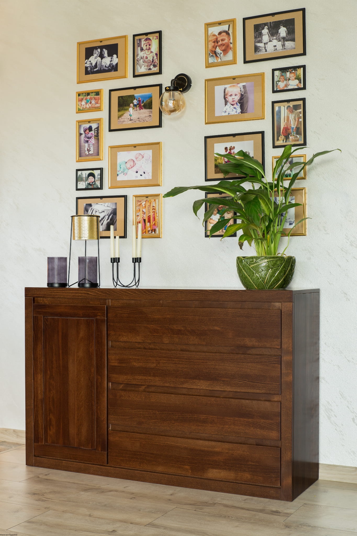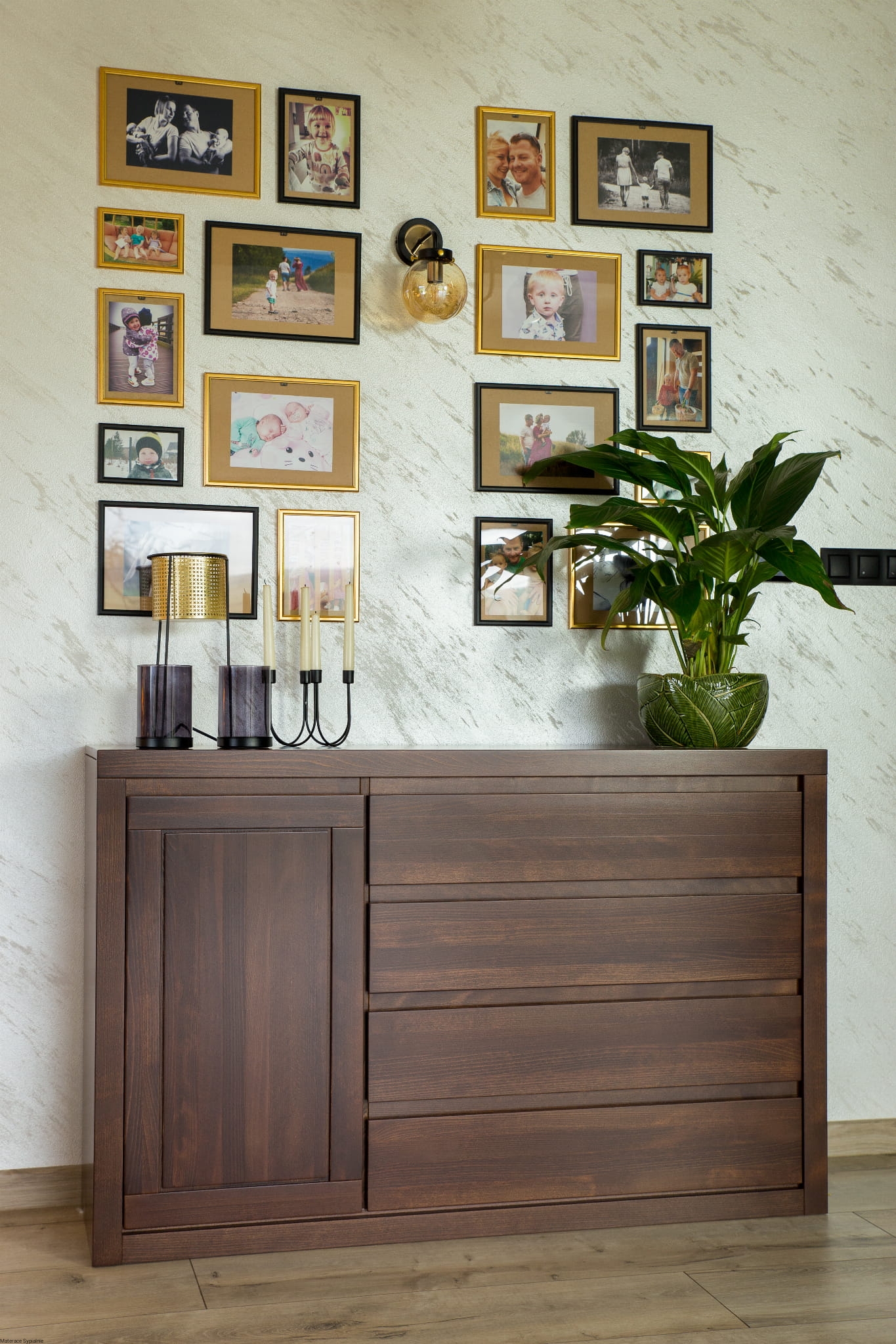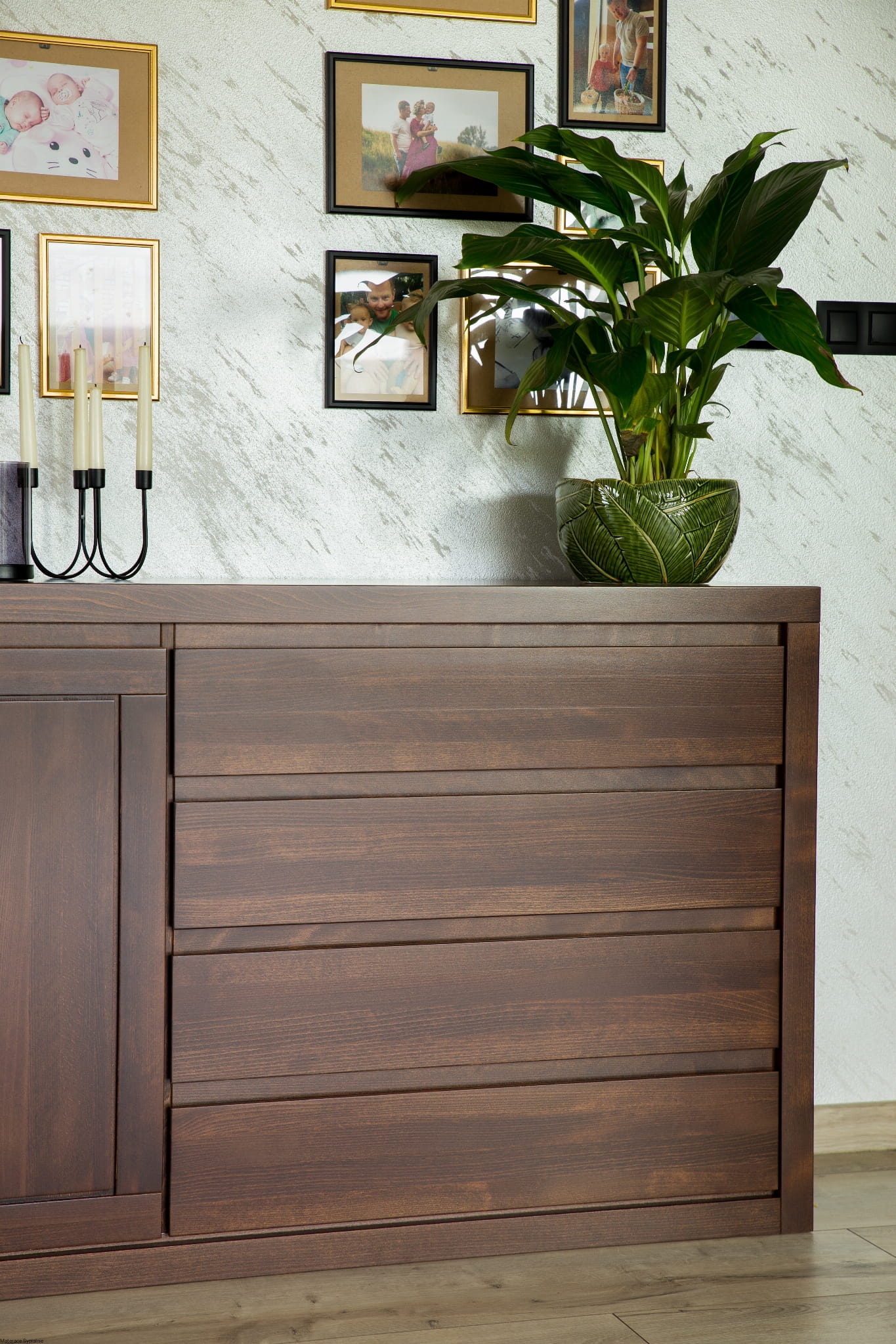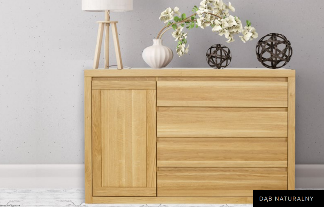 Dębowa komoda KD308 została zaprojektowana w nowoczesnym, minimalistycznym stylu. Pozbawiona widocznych uchwytów, urzeka prostotą formy. Funkcjonalne i pojemne szuflady idealnie posłużą do wygodnego przechowywania domowych przedmiotów. Natomiast przestronny blat mebla to idealne miejsce na wyeksponowanie dekoracji lub rodzinnych fotografii. Szafka jest podzielona na pół, w środku znajduje się półeczka z drewna dębowego. Największym atutem komody jest bardzo wysoka jakość. Komoda nie jest skręcana a zbijana, dzięki czemu niepodważalna jest jakość wykonania komody. Dębowa komoda będzie służyć ci przez bardzo długi czas. Jest to mebel, który się nie psuje i często przechodzi z pokolenia na pokolenie. Komodę można zamówić w wielu kolorach do wyboru. Dostępne wersje zarówno gładkie, jak i głęboko szczotkowane (chropowata nawierzchnia mebla)
